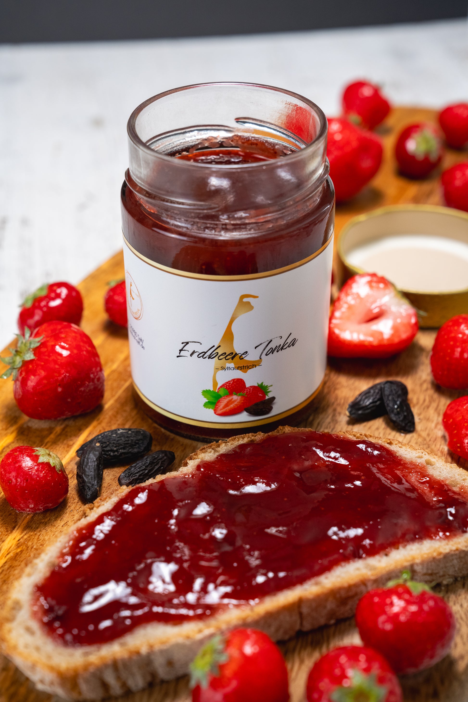 Doch was diesen Aufstrich wirklich außergewöhnlich macht, ist die geheimnisvolle Tonkabohne. Oft als „Glücksbohne“ bezeichnet, stammt sie aus den Wäldern Südamerikas und wird von den Einheimischen aufgrund ihrer betörenden Vanille- und Mandelaromen hochgeschätzt. In der Sylter Küche wurde mit dieser kostbaren Bohne experimentiert; ihre magischen Aromen mit den heimischen Erdbeeren kombiniert, um einen Aufstrich zu kreieren, der die Sinne verzaubert.