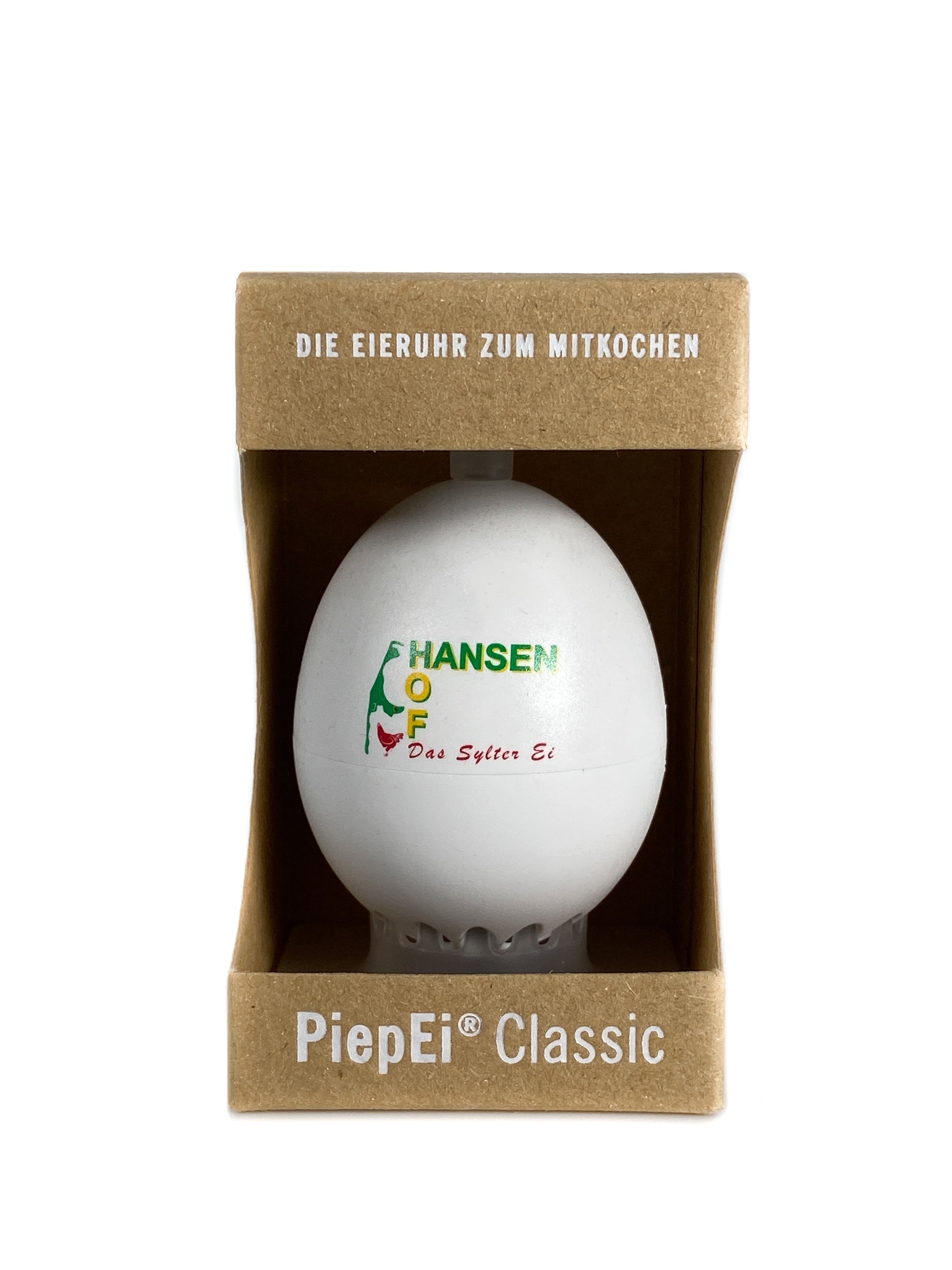 Piep Ei Edition Hansenhof mit 3 Melodien. – Die Eieruhr zum Mitkochen. – Das PiepEi einfach mit den Eiern zusammen mitkochen. Das PiepEi spielt 3 Melodien, man unterscheidet zwischen: "killing me softly" für Weicheier, "Ich wollt ich wär ein Huhn" für Mittelweiche Eier und "Triumphmarsch" für hart gekochte Eier.